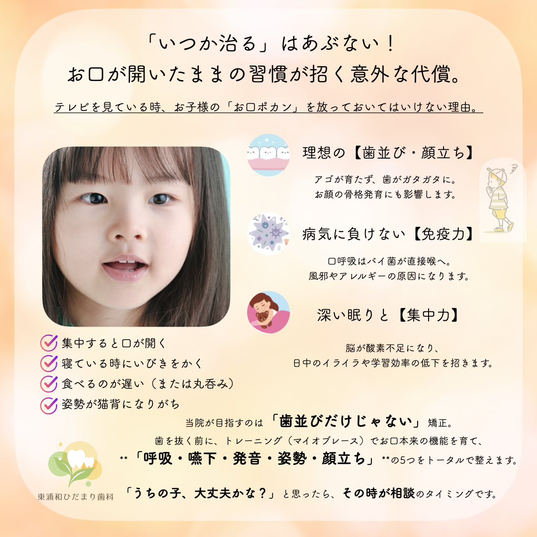 お子様がテレビに集中している時や、ぼーっとしている時。 ふとお口が開いたままになっている姿を見て、「まだ小さいから」